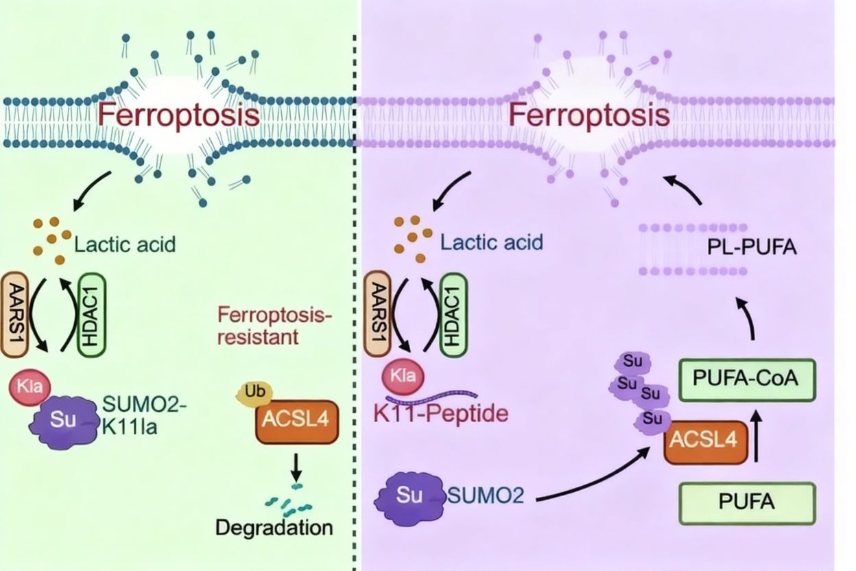 機制研究表明,SUMO2-K11乳酸化通過調控長鏈脂酰輔酶A合成酶4的穩定性影響鐵死亡敏感性。ACSL4是鐵死亡的關鍵執行者,負責催化多不飽和脂肪酸的酯化,促進脂質過氧化底物的生成。研究人員發現,SUMO2與ACSL4存在直接相互作用,且SUMO2-K11乳酸化可削弱這一相互作用。