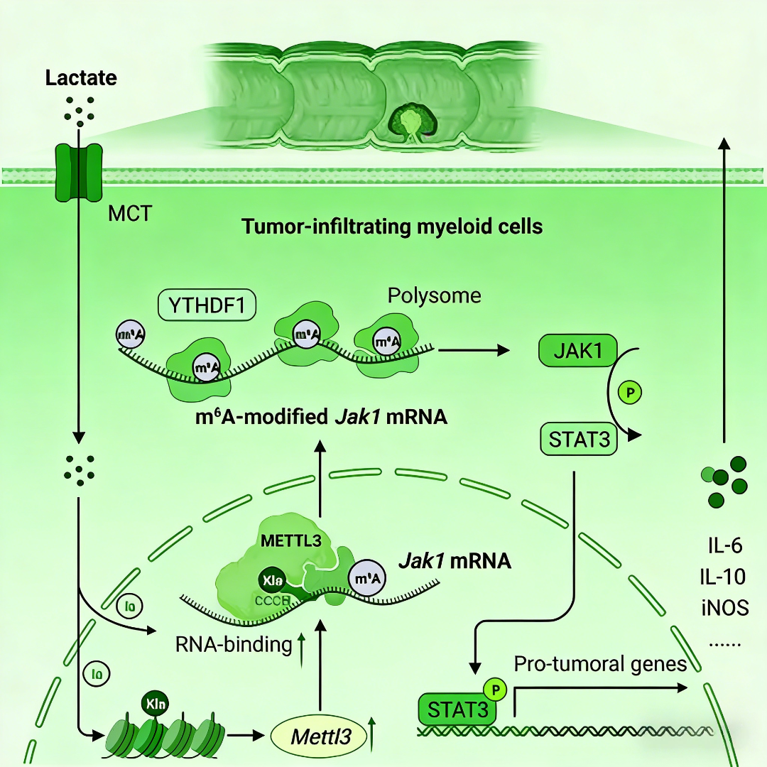 METTL3表達上調后,其催化產生的m6A RNA修飾在腫瘤浸潤髓系細胞中全局性增加。通過高通量測序結合功能驗證,研究發現Jak1 mRNA是METTL3的關鍵下游靶標。METTL3介導的m6A修飾特異地發生在Jak1 mRNA的特定區域,該修飾被m6A閱讀蛋白YTHDF1識別。YTHDF1通過促進m6A修飾mRNA的翻譯效率,顯著增強了JAK1蛋白的合成。JAK1是Janus激酶家族成員,其蛋白水平的升高導致下游信號轉導與轉錄激活因子STAT3的磷酸化被持續激活。STAT3通路是免疫抑制信號樞紐,其激活可驅動一系列免疫抑制相關基因的表達,從而鞏固和增強腫瘤浸潤髓系細胞的免疫抑制表型與功能。由此,乳酸化修飾通過上調METTL3,建立了一條從表觀遺傳到轉錄后調控的級聯通路,最終放大了細胞內的免疫抑制信號。