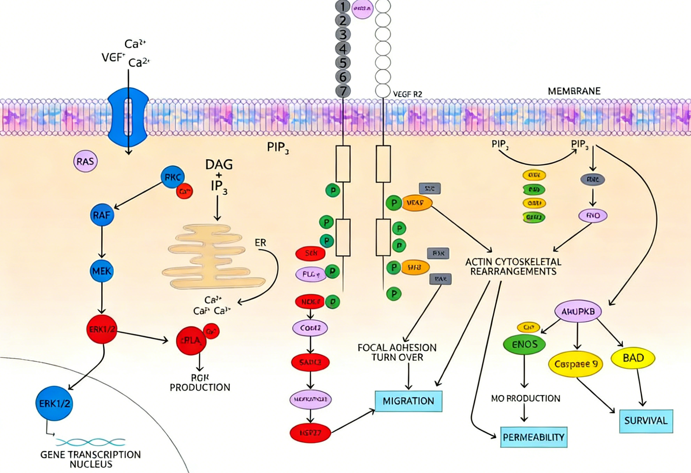 1. 增殖通路:通過(guò)激活PLCγ-PKC-Raf-MEK-ERK/MAPK級(jí)聯(lián)反應(yīng),促進(jìn)內(nèi)皮細(xì)胞增殖。